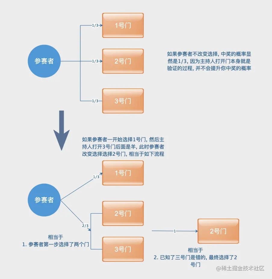 游戏刚开始时,中大奖的概率一目了然,两头羊和一辆车,参赛者有1/3的概率选中那扇后面是轿车的大门。但正如之前提到的,这个节目及其主持人蒙提·霍尔之所以能够在美国概率学课本中占得一席之地,是因为这个节目还有一个精心的安排。当参赛者选择了一扇门之后,蒙提会打开剩下的两扇门中的一扇,向观众和选手展示这扇门后面的奖品——一头羊,然后蒙提会再次询问参赛者是否要改变当初的选择,也 就是在最初选择的那扇门和剩下的那扇门中再选择一次。