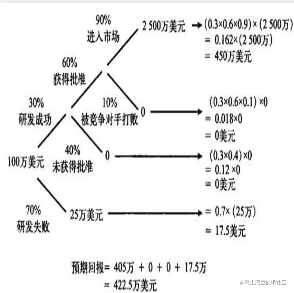 但是当期望值大于你的投入的时候, 你还是需要区根据概率来决定是不是要进行投入, 因为某些事件是极小概率获得大量收益的, 但是因为概率比较小, 需要你仔细考虑. 假设你的一个朋友建议你向一家研究中心投资100万美元用于开发男性防脱发产品,你或许会问成功的概率有多大,而你的朋友的回答很复杂。由于这是一个研发项目,因此研发团队研制成功的概率只有30%,如果最终研制产品失败了,那么你 将收回25万美元,因为这部分资金原本是留着用于市场推广(用户测试、广告宣传等)的;即使最终产品研制成功了,美国食品药品监督管理局认为这一神奇的治疗脱发的产品对人体安全并批准进入市场的概率也只有60%; 到了那个时候,即使我们的产品安全有效,依然还有10%的概率会出现一个强劲的竞争对手,带着更好的产品与我们一同进入市场,占据全部的市场份额。如果一切顺利——产品安全、有效,而且竞争者也没有出现,那么你将获得最多2500万美元的投资回报。