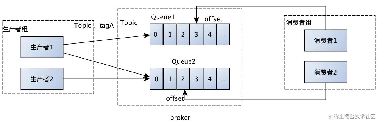 - 一个Topic可以包含多个queue,这里的queue跟rabbitmq中的队列不是一回事,是分区的概念(rocketmq里叫queue,kafka里叫分区)。一个Topic可以包含多个分区,消息会被均衡的存储到不同的分区