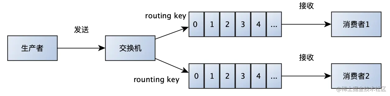 - 交换机将消息路由分发到匹配routing key的队列存储