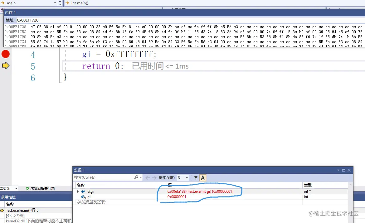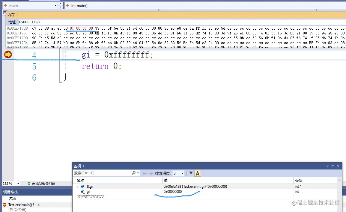 2 我们还是把内存监控的窗口调出来,在程序没有运行到gi = 0xffffffff之前,我们修改内存里面的值。