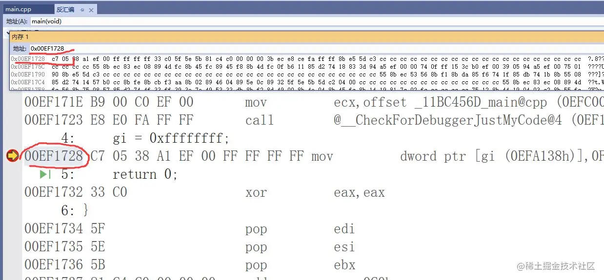 0x00EF1728到底是不是mov指令的地址?我们按照如下步骤操作:
