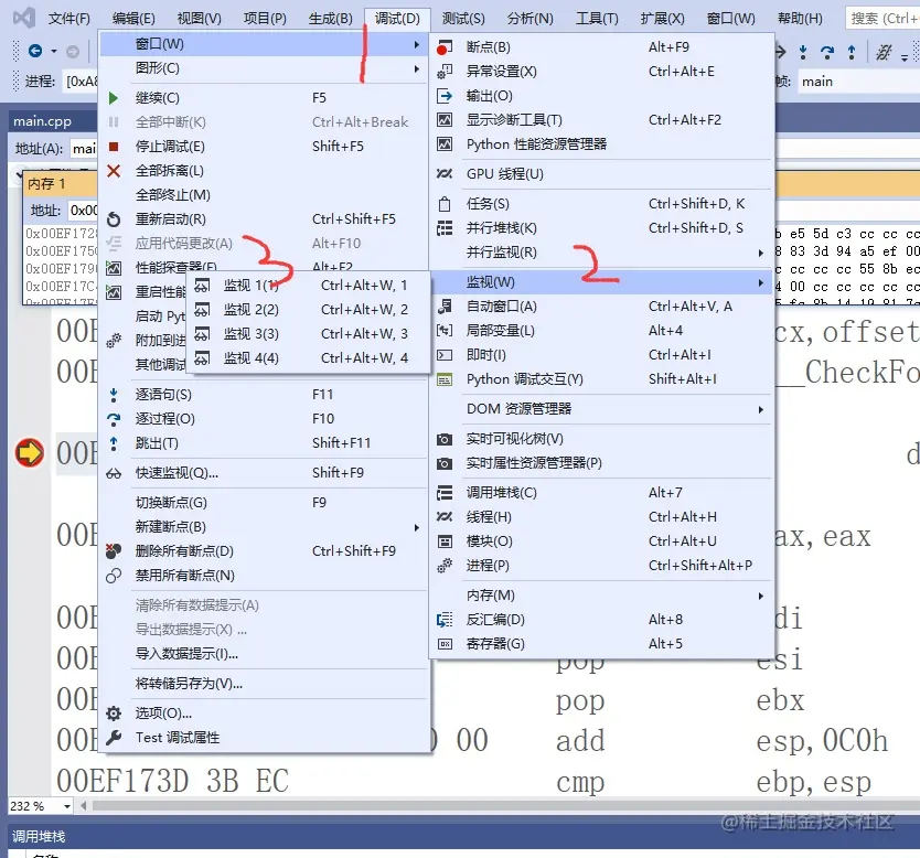 调试 ---> 窗口 ---> 反汇编;或者是alt + 8快捷键;