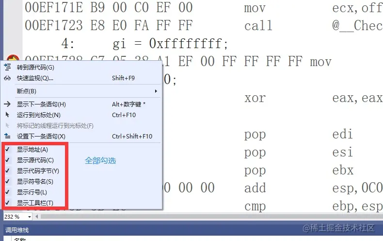 现在,点击右键,把红色方框的全部选择;就可以看到C语言中无法看到的信息了。