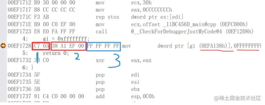Mov指令的地址是什么?是不是这个00EF1728呢?