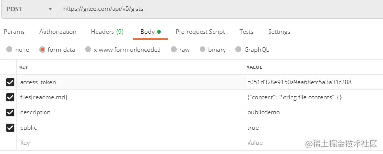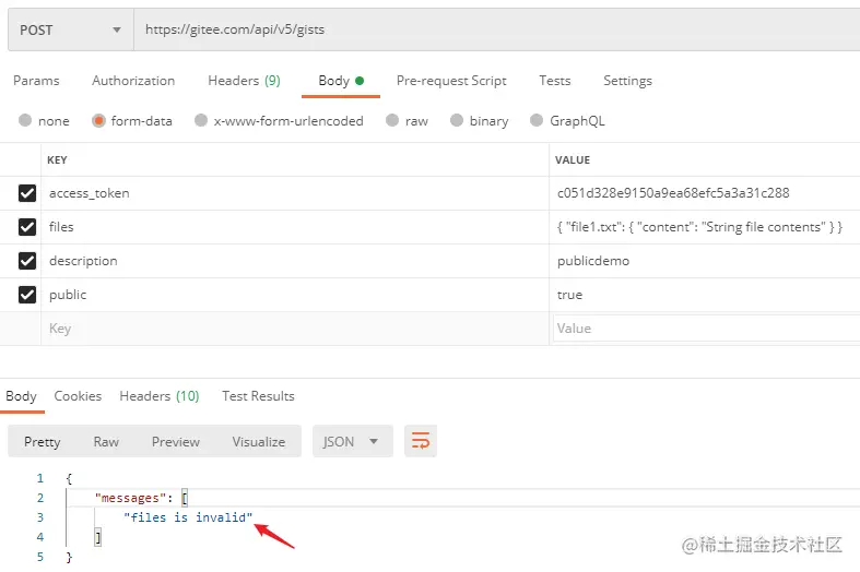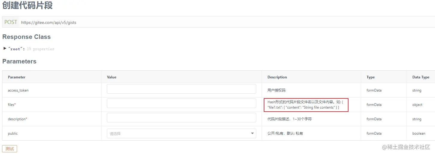 今天看 Gitee API,创建代码片段的接口 gitee.com/api/v5/swag… 文档描述如下:
