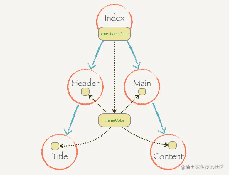 假设原来主题色是绿色,那么 Index 上保存的就是 this.state = { themeColor: 'green' }。如果要改变主题色,可以直接通过 this.setState({ themeColor: 'red' }) 来进行。这样整颗组件树就会重新渲染,子组件也就可以根据重新传进来的 props.themeColor 来调整自己的颜色。