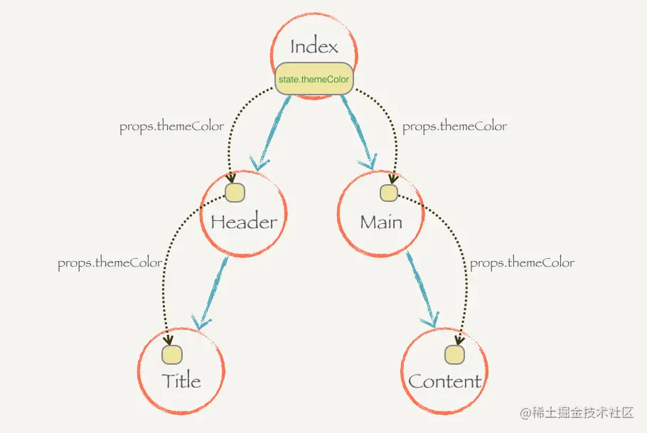 就像这样,Index 把 state.themeColor 放到某个地方,这个地方是每个 Index 的子组件都可以访问到的。当某个子组件需要的时候就直接去那个地方拿就好了,而不需要一层层地通过 props 来获取。不管组件树的层次有多深,任何一个组件都可以直接到这个公共的地方提取 themeColor 状态。