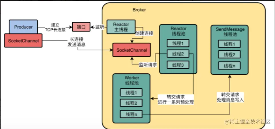 rocketmq的网络通信架构模型。首先生产者和服务端通过reactor主线程建立tcp长连接,客户端与服务端采用socketchannel进行通信,通过socketschannel发送消息,通过reactor线程池去监听socketchannel的消息到达。reactor线程池只负责把消息取出来,在消息被正式处理前需要加密验证,编码解码,网络连接管理通过worker线程池去做这些准备工作。再通过sendmessage线程池去发送消息。reactor主线程负责建立长连接reactor多线程并发监听消息请求达到。再通过worker多线程去处理消息,读写磁盘通过业务线程池处理,各个线程池执行时,不会影响其他线程池在其他环节处理请求。 reactor线程池采用aio多路复用