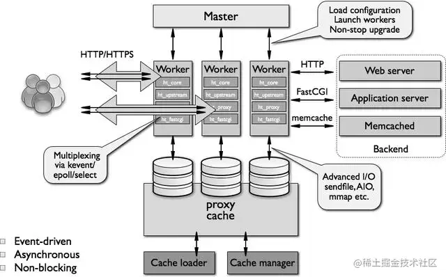 Master 进程:管理 Worker 进程。对外接口:接收外部的操作(信号);对内转发:根据外部的操作的不同,通过信号管理 Worker;监控:监控 Worker 进程的运行状态,Worker 进程异常终止后,自动重启 Worker 进程。