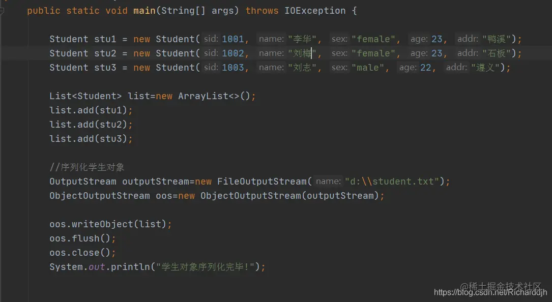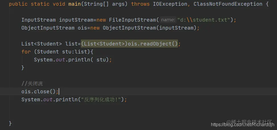 反序列化即使构造ObjectInputStream对象,使用它的readObject()方法获得Object对象,然后强转为对应类的泛型集合,即可遍历拿到学生对象数据了.