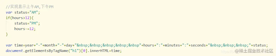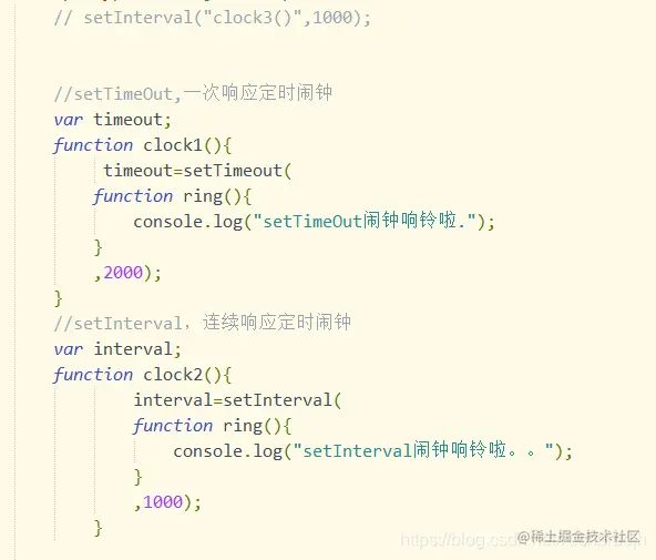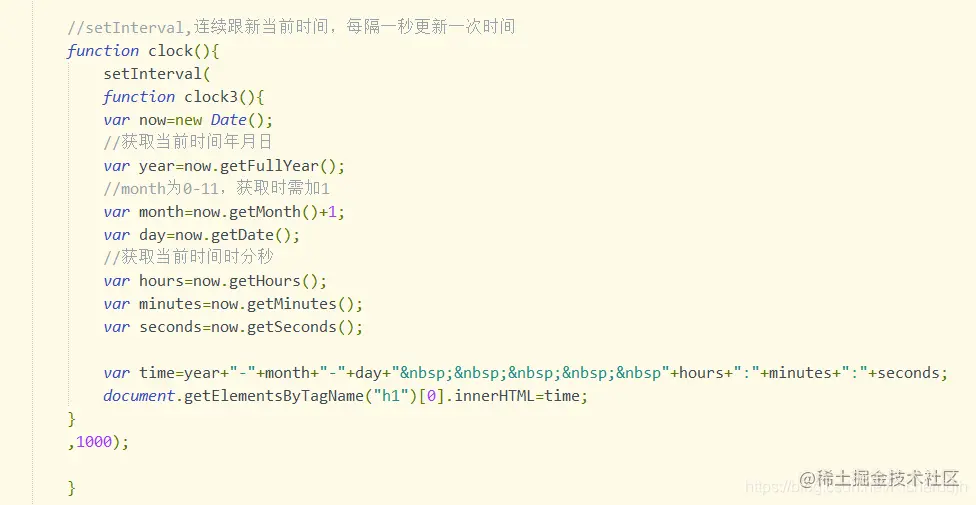 使用JavaScript中的setInterval()实现当前时间动态显示 言尘java 2021-01-28 797 阅读1分钟 按钮-闹钟3,可以控制时间开启 时间显示函数如下,需知道在body下有一个h1标签用于显示时间 其它setTimeout()和setInterval()的使用案例 关闭闹钟方法:clearTimeout(),clearInterval() 添加上午AM,下午PM显示:下午就把24小时制时间减去12.