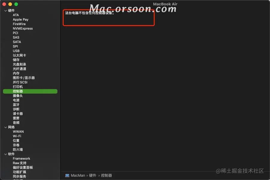 然后再点击「控制器」或「iBridge」(具体取决于你用的 Mac 系统版本),如果右边有看到“Apple T2 芯片”,就表示你的 Mac 带有 Apple T2 安全芯片,如果没有,就表示不带 Apple T2 安全芯片。