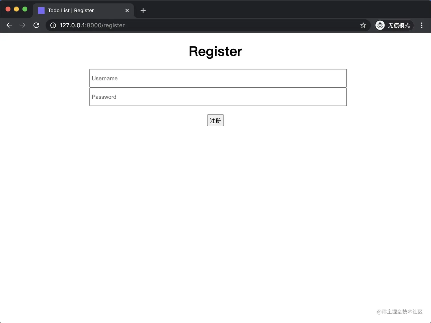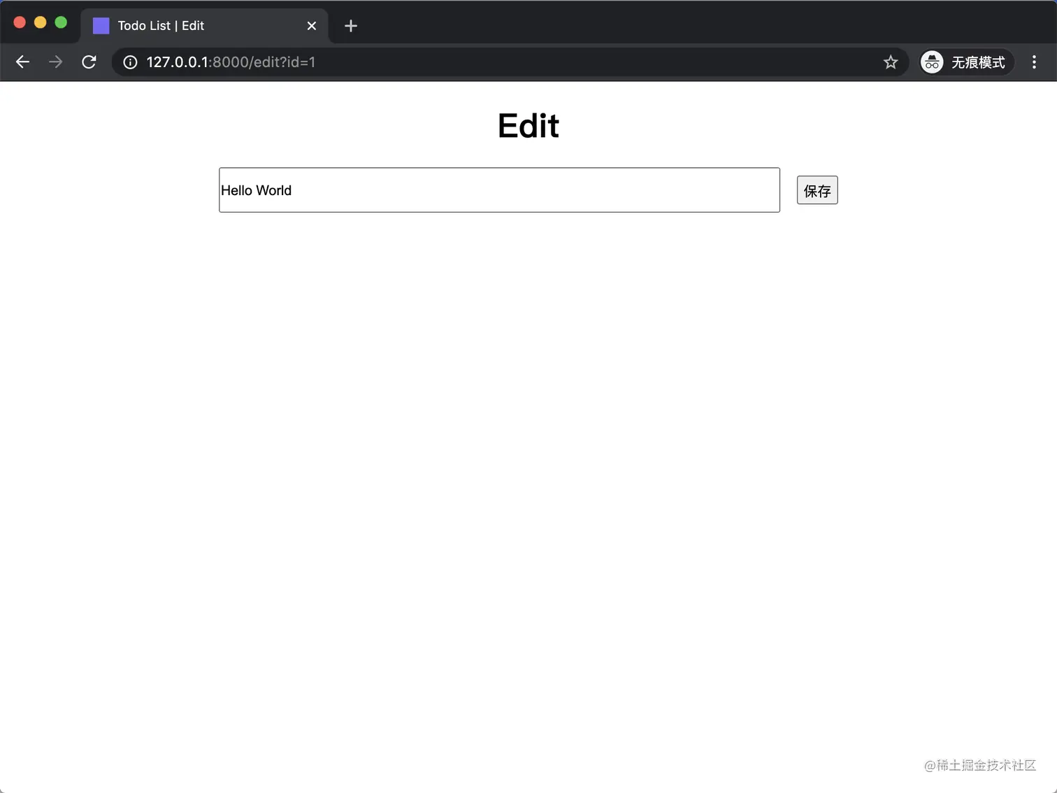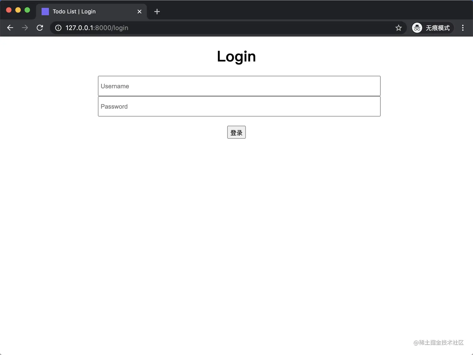 打开浏览器,地址栏输入 http://127.0.0.1:8000/ 或者 http://127.0.0.1:8000/index,你将看到 Todo List 程序首页:
