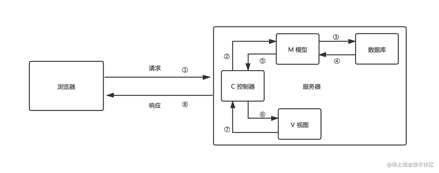 C(Controller):控制器,负责基础逻辑,如从模型层读取数据并将数据填充到视图层,然后返回响应。