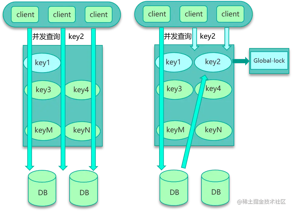 - 使用全局锁。当缓存请求 miss 后,先尝试加全局锁,只有加全局锁成功的线程,才可以到 DB 去加载数据。其他进程/线程在读取缓存数据 miss 时,如果发现这个 key 有全局锁,就进行等待,待之前的线程将数据从 DB 回种到缓存后,再从缓存获取。