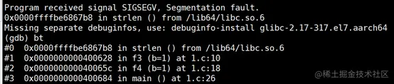 我们通过gdb运行后,可以看到strlen地方会触发SEGFAULT,引发进程挂掉