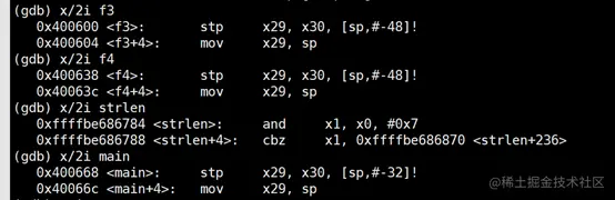 从当前的sp开始,frame 0是strlen,这块没有开栈,因此上一级的调用函数仍然是x30,因此推导:frame1调用为f3