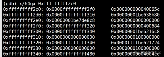 可以看到,f3函数开辟的栈空间为48字节,因此,倒推frame2的栈顶为当前的sp + 48字节:0xfffffffff2c0