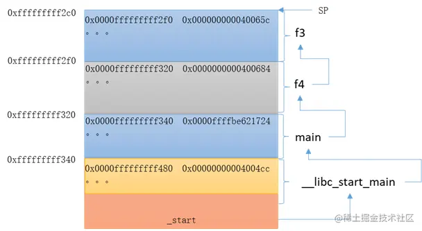 可以看到,f4函数开辟的栈空间也是为48字节,因此,倒推frame3的栈顶为当前的0xfffffffff2c0 + 48字节:0xfffffffff2f0