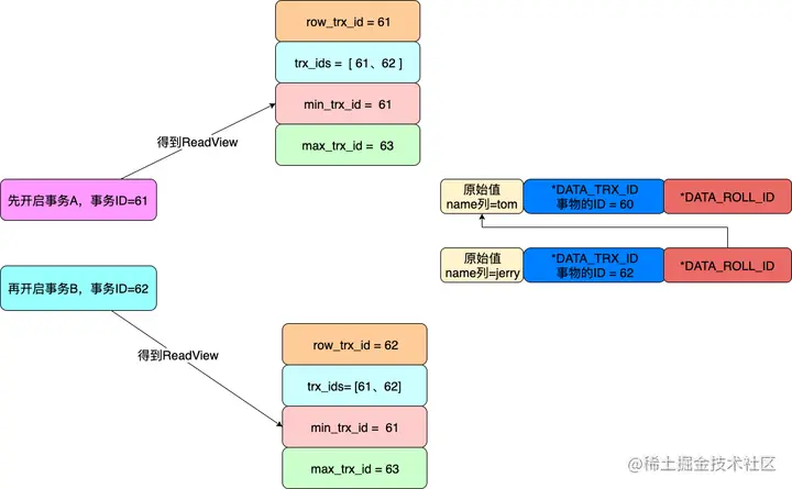 还是使用这个例子:假设事务A和事务B并发开启,并且各自得到了图中的ReadView。然后很快,事务B就将数据name = tom改成了name = jerry(未提交)。那这时事务A去select会检索出什么结果呢?