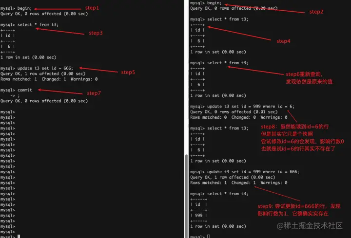 上图中的右部分的会话中begin之后,就会创建读视图,所以它的多次select使用的是同一个视图,所以结果都是一样的。即使数据中途被左边的事务更改了,它也没有受到影响。