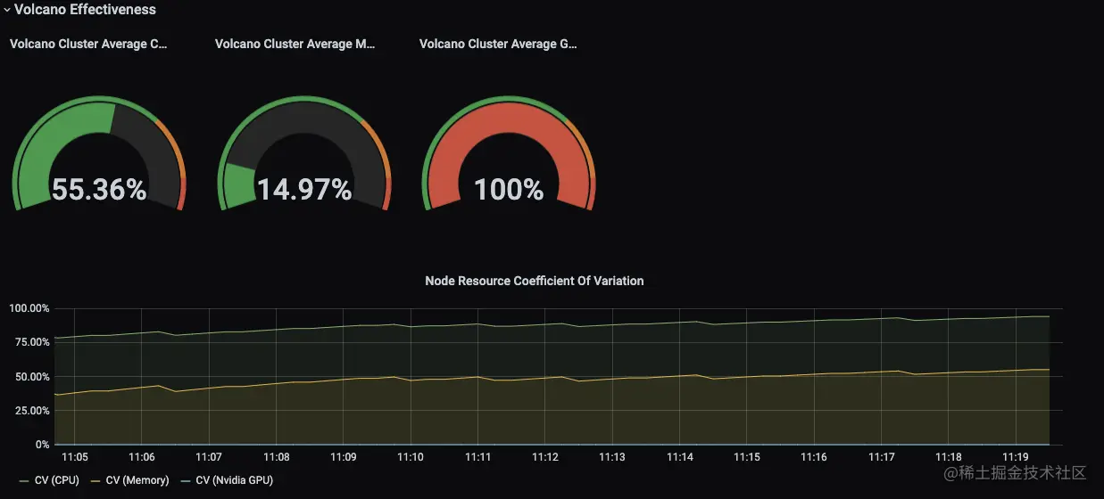 通过Volcano调度效率数据,我们可以看到整体集群的资源申请request情况,通过Node Resource Coefficient Of Variation 我们可以看到不同节点之间的资源分布情况。