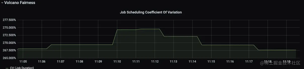 Job Scheduling Coefficient Of Variation 是 Volcano 监控的公平性指标,展示了不同Job调度时间长度之间的差异值,目前的插件策略下,是相对比较极端的,部分Job在非常短的时间内被调度完成,剩余的时间比较长。