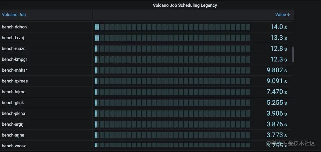 通过 Volcano Job Scheduling Legecny 我们可以看到当前运行比较长的Vocalno Job运行时间长度,通过比对Scheduler日志,我们可以逐步找到相应的原因,并且调整插件来优化这个过程。