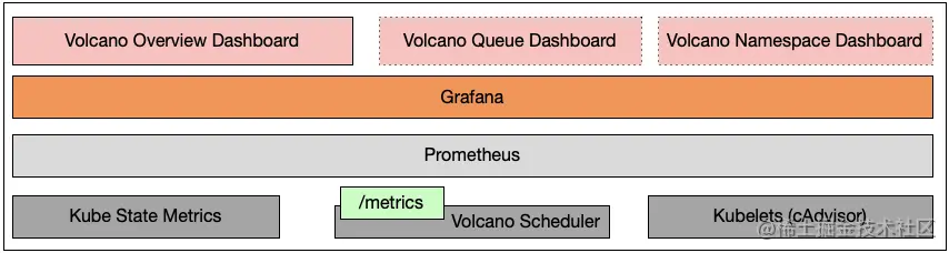 目前在Volcano 中引入了三个监控组件,Kube State Metrics,Prometheus以及Grafana。