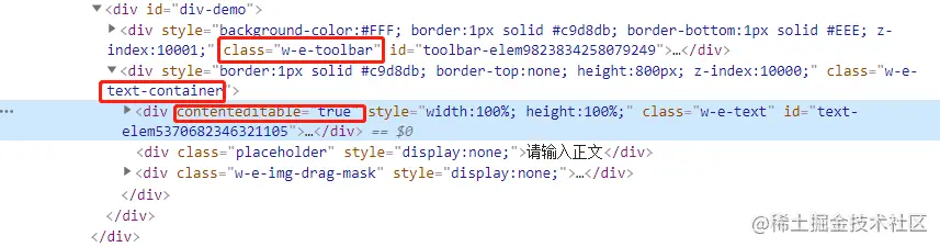 class Editor,然后实现核心的create方法,当中肯定包含了各种渲染页面元素啦(包括菜单,用户实际编写的区域),监听事件,实现我们初步定下的3个功能(加粗,设置标题,设置颜色),这里要注意的是,实际编写的区域是个div,加上属性(contenteditable),至于我怎么知道的,因为我调研努力呀~(手动滑稽,其实是因为下方f12审查元素发现的真相) -
