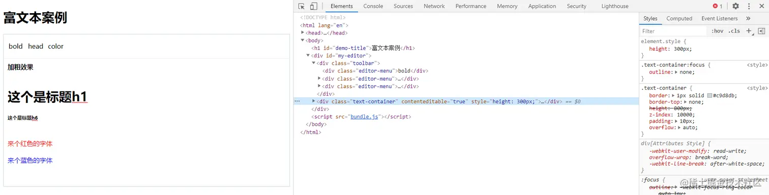 文档真详细,写的真好,在文档buff的加持下,调研demo很快就完成了!巧就是这么巧,期间我看到了文档中贡献代码,加入团队,开发人员等字样,在加上之前在寻找使用哪款富文本编辑器时,看到了这么句话“争做国内使用体验Z好的开源 Web 富文本编辑器!”,老夫的开源的梦就被点燃了,以前空了只是会下载些开源项目的源码看看,简单了解下实现的思路,然后就当一条咸鱼,不了了之了。那既然想要加入开源团队,那至少要对富文本实现的原理有所了解吧,于是这个项目就诞生了,纯粹实现些简单的功能,正好之前自学过一点ts的知识,用webpack + ts简单的实现下加粗,设置标题,设置颜色吧
