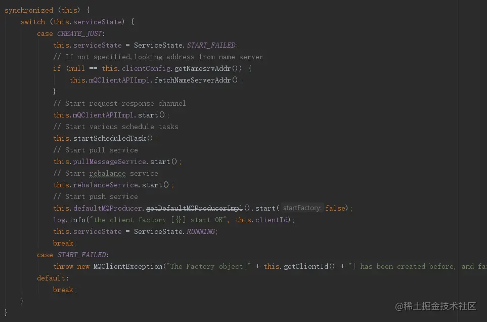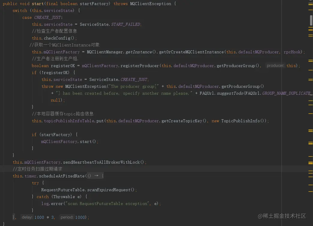 3.校验生产者组,创建MQClientInstance对象,并将生产者交由其管理。最终调用MQClientInstance对象start方法