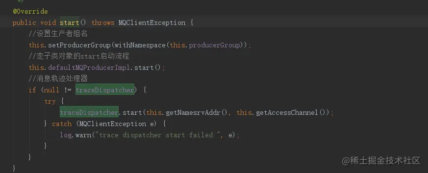 2.调用子类的流程启动方法。生产者创建时会根据是否开启消息轨迹创建消息轨迹处理对象