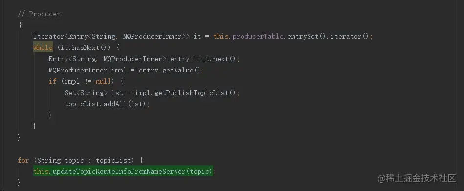 5 先从生产者中收集所要发送的主题:Topic,然后遍历Topic列表,调用updateTopicRouteInfoFromNameServer(topic)获取每个Topic的路由信息。