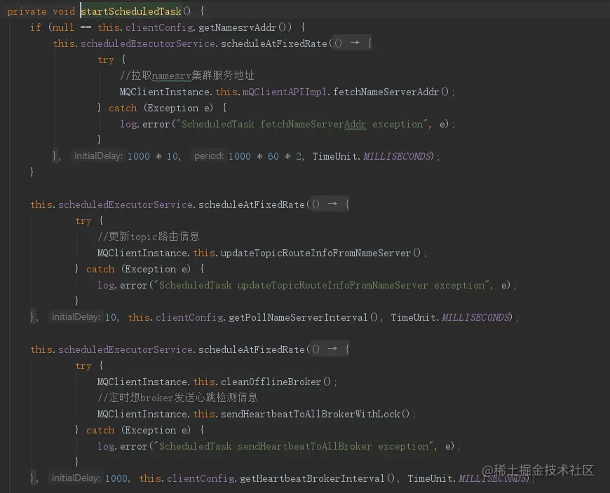 4.生产者流程启动的真正方法。通过startScheduledTask()启动多个定时任务线程。包括namesrv集群地址的获取,topic路由信息,定时心跳检测等信息