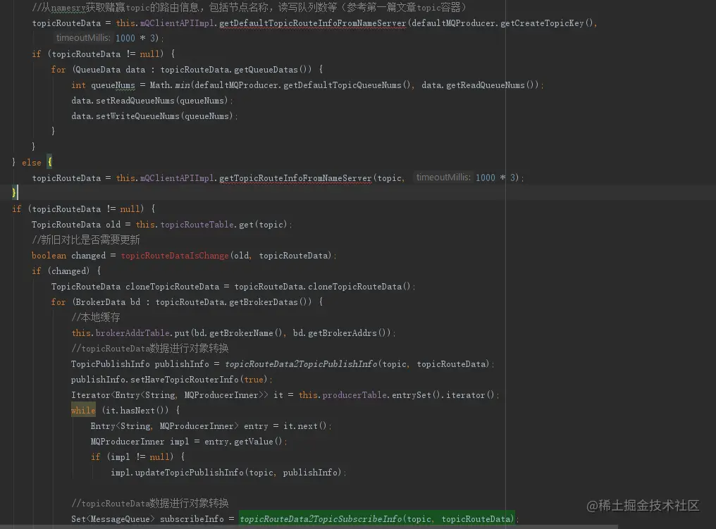 6.下面来看看截取的部分代码片段updateTopicRouteInfoFromNameServer(topic):首先去去namesrv端获取topic的路由信息,然后本地进行缓存。并将获取的路由信息数据转换成所需的数据对象。
