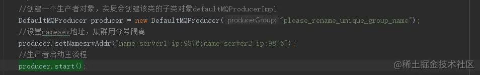 1.生产者启动入口,传入生产者组名创建一个生产者对象,实质会创建一个DefaultMQProducerImpl子类对象。