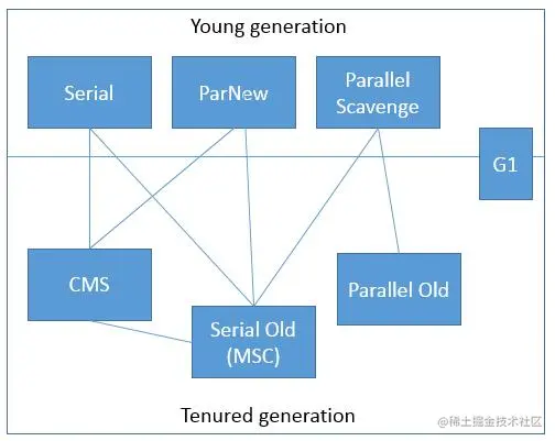 图中展示了其中作用于不同分代的收集器,如果两个收集器之间存在连线,就说明它们可以搭配使用。图中收集器所处的区域,则表示它是属于新生代收集器抑或是老年代收集器。