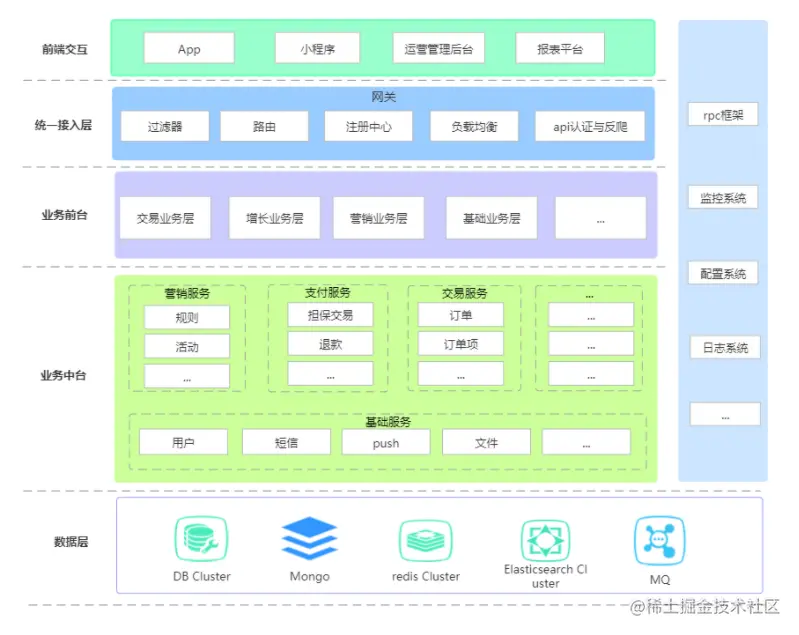 其次需要掌握对系统进行分层设计的思想。前后端分离,表现层、控制层、模型层各司其职,无论你是从事后端开发还是前端开发,观察那些主流的框架如springMVC、Vue等,无不在告诉我们分层设计的重要性。同样当你在设计一个大用户量产品的系统架构,有必要将系统合理的划分为接入层、接口转发层、服务控制层、服务执行层、缓存层、数据访问层等。