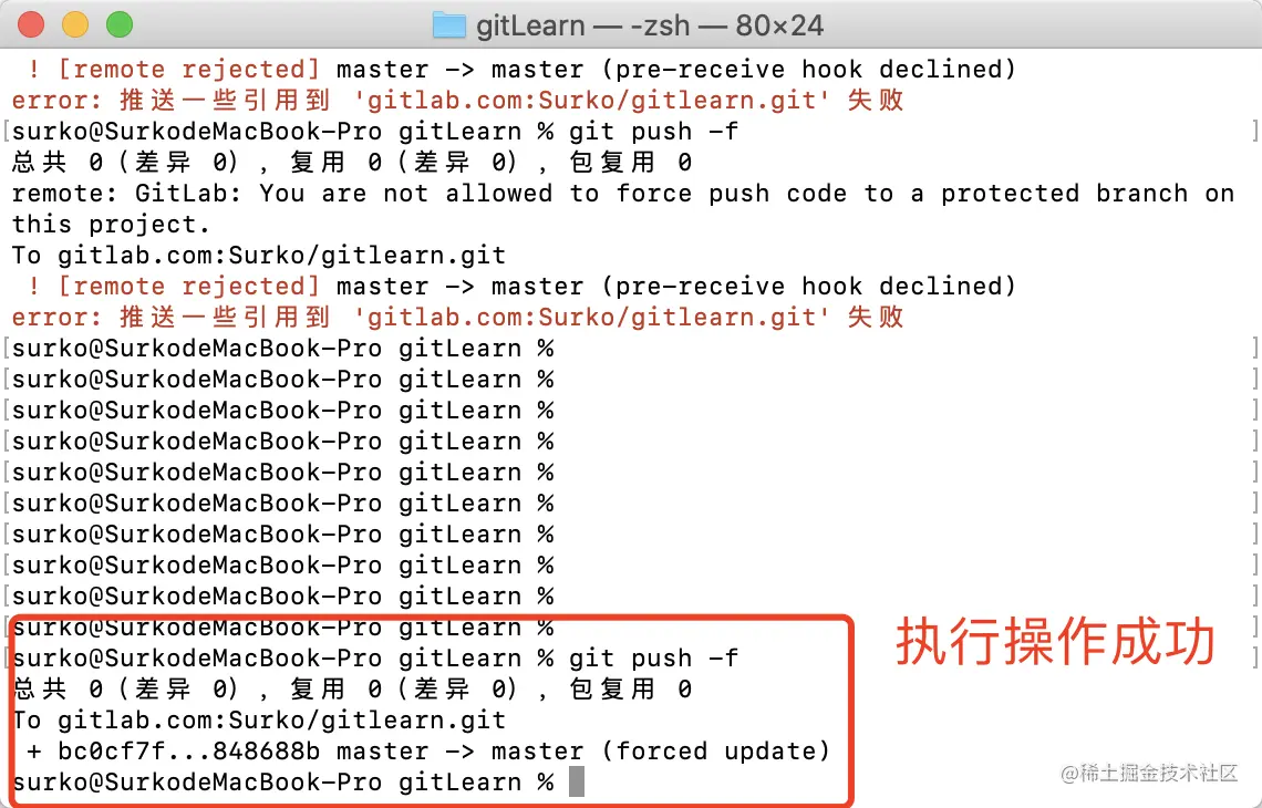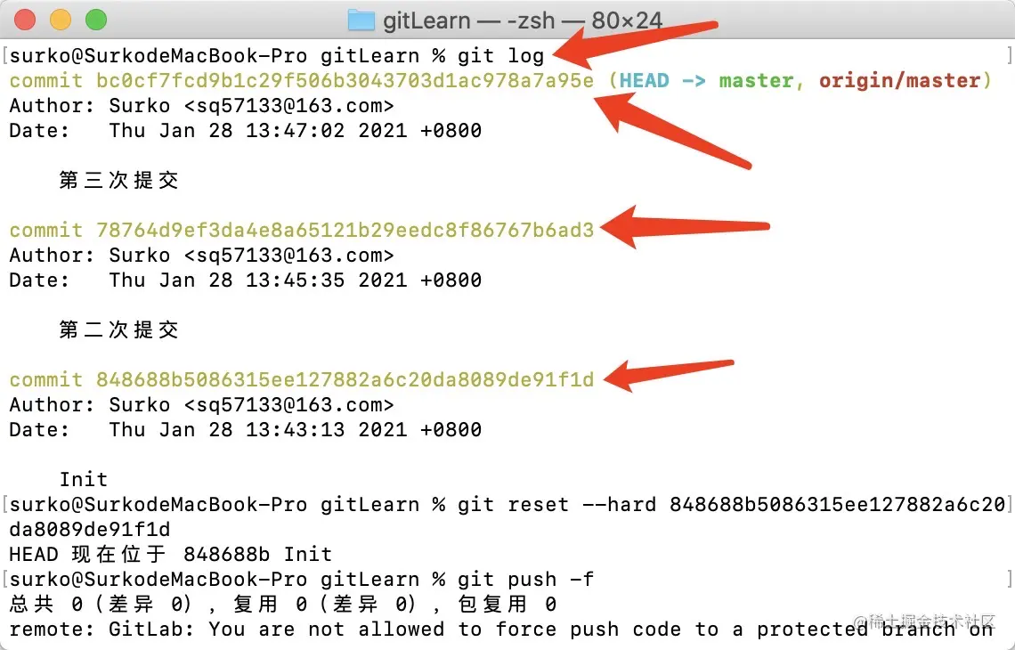 git push -f // 接着需要强制推送代码到远程仓库
