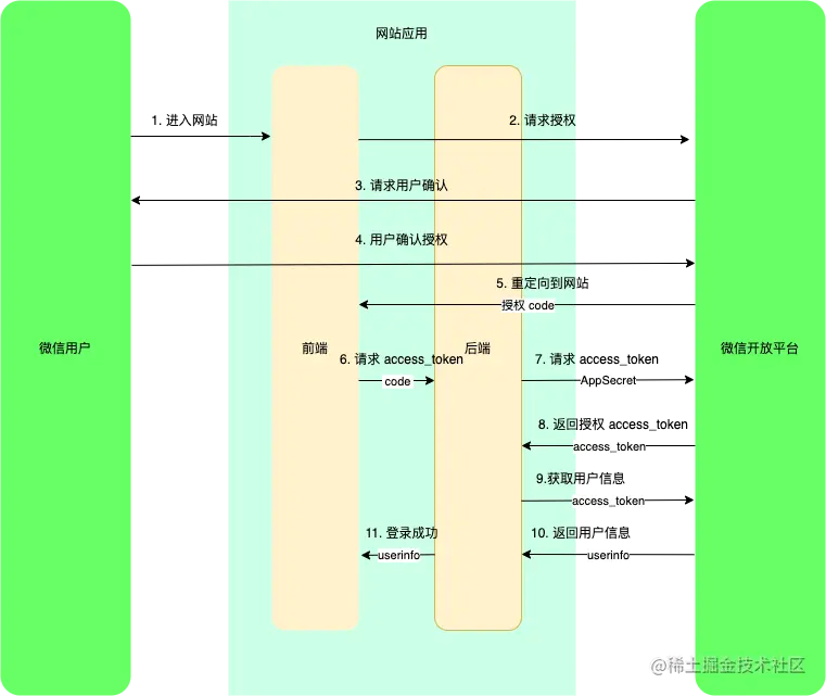 在获取到用户授权,也就是获取到 code 之后,接下来网站应用的步骤就是从上图中的 5-11 步骤所示,之前的步骤在上面已经介绍过了,接下来详细的介绍一下 5-11 步骤操作: