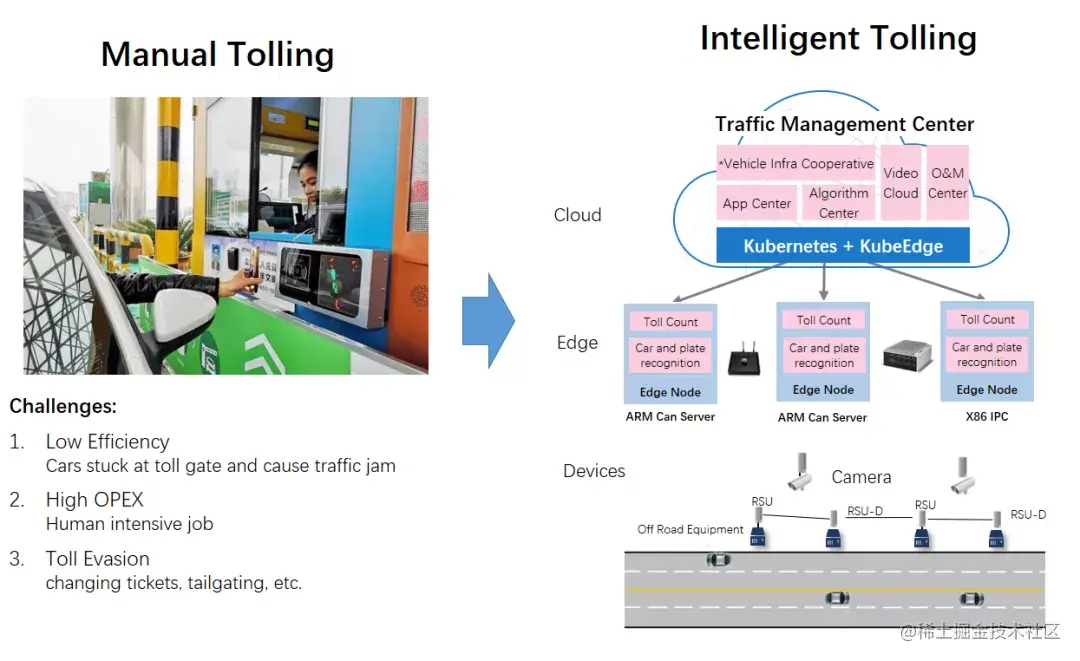 目前,KubeEdge 已被广泛应用于交通、能源、互联网、CDN、工业制造、智慧园区等行业。在中国的省界高速公路电子收费系统(ETC)中,KubeEdge 帮助管理了全国 34 个省、市、自治区中的 29 个总计约 100,000 个边缘节点和 500,000 多个边缘应用程序。借助这些应用,该系统每天处理 超过 3 亿条数据,将收费站的交通效率提高了 10 倍。
