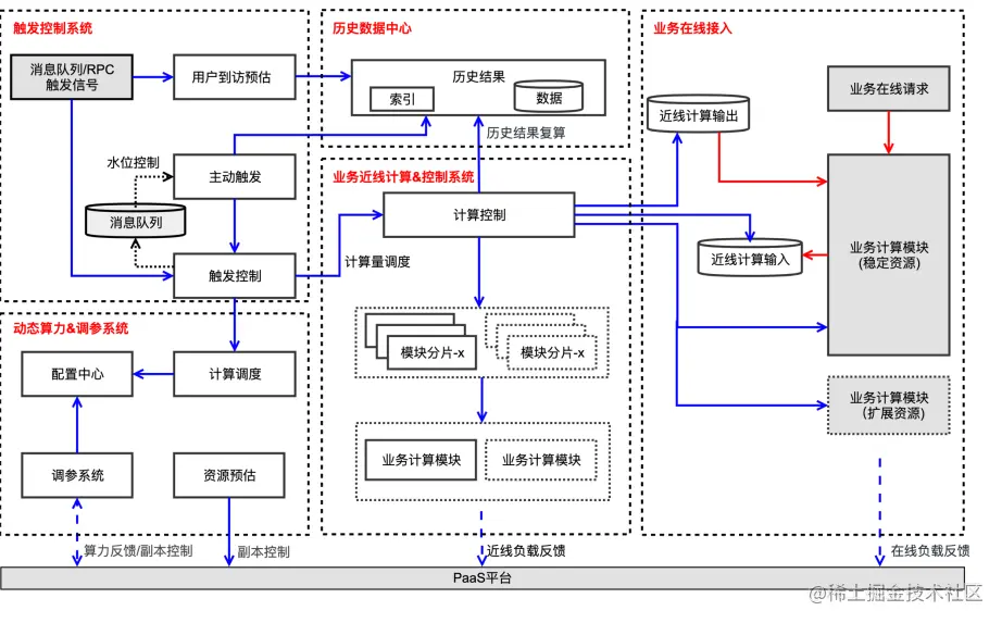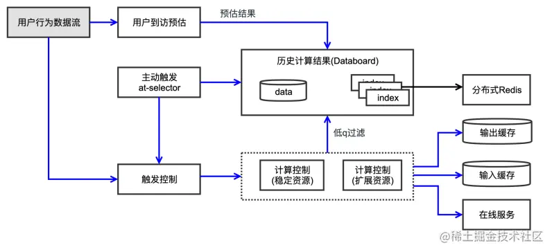 另一方面,在资源一旦出现冗余,就可以把主动触发的信号提取出来触发近线计算,包括:1)削峰机制保存的信号。2)系统预估的会到访的流量;3)以及历史全量的触发信号索引,按照优先级进行主动触发。