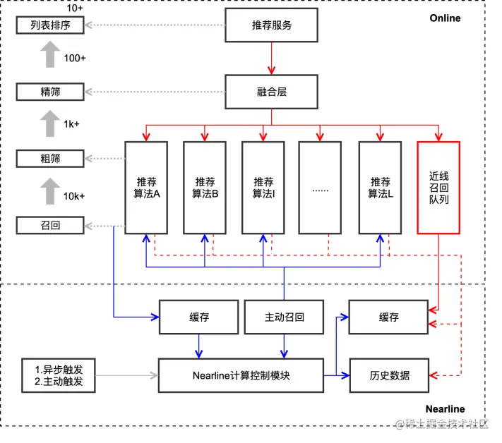 在推荐算法服务这一层,每个推荐算法对应召回的是数千或者数万条的计算结果,由于资源和速度的限制,我们不能对这数千或者数万条结果都进行粗排,并且粗排的模型也需要控制复杂程度。因此我们考虑将多个推荐算法服务的召回结果进行缓存,再放到近线系统来进行综合打分之后生成一个用户对应的近线计算候选集,作为一路新的召回。之后在线请求来了之后,使用这路新的召回结果,进行轻量的在线计算之后就可以返回给用户。