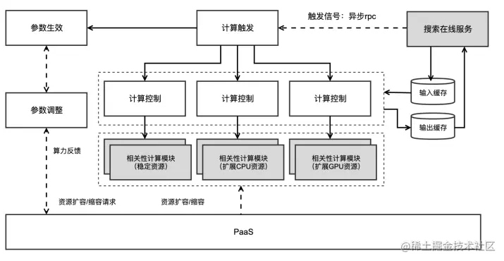 跟推荐场景不同的是,搜索的场景下,检索词的全集更大,因此我们针对这种场景,用上了更激进的削峰填谷机制,如果没有足够的算力,直接将触发信号缓存到消息队列,在低谷期再把计算完成。
