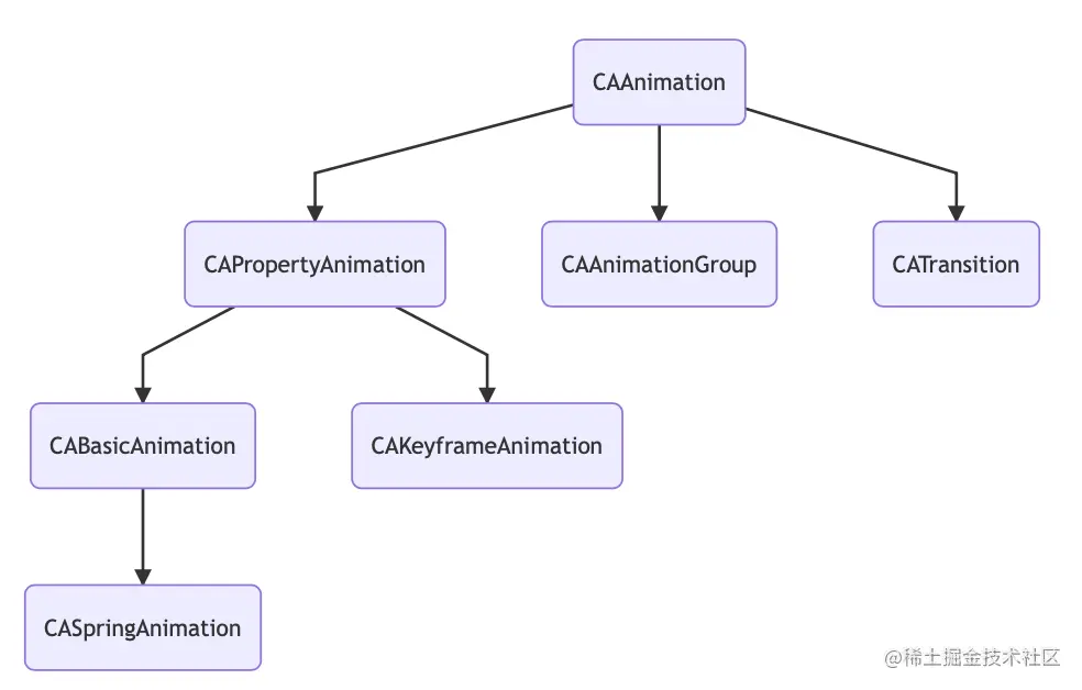 A(CAAnimation) -->B1(CAPropertyAnimation)A--> B2(CAAnimationGroup)