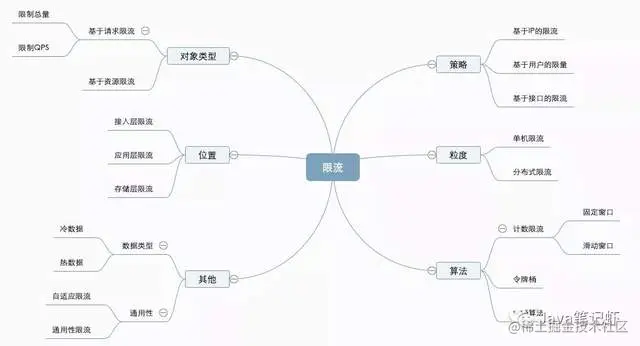 限流,拆分来看,就两个字限和流,限就是动词限制,很好理解。但是流在不同的场景之下就是不同资源或指标,多样性就在流中体现。在网络流量中可以是字节流,在数据库中可以是TPS,在API中可以是QPS亦可以是并发请求数,在商品中还可以是库存数... ...但是不管是哪一种『流』,这个流必须可以被量化,可以被度量,可以被观察到、可以统计出来。我们把限流的分类基于不同的方式分为不同的类别如下图。