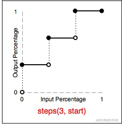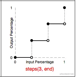 w3c官网指出:teps(3, end)也是将动画分为三段,但跳跃点为end,动画在每个周期的终点发生阶跃(即图中的空心圆 → 实心圆)。虽然动画的状态最终会到达100%,但是动画已经结束,所以100%的状态是看不到的,因此我们最终看到的动画的过程是0 → 1/3 → 2/3。