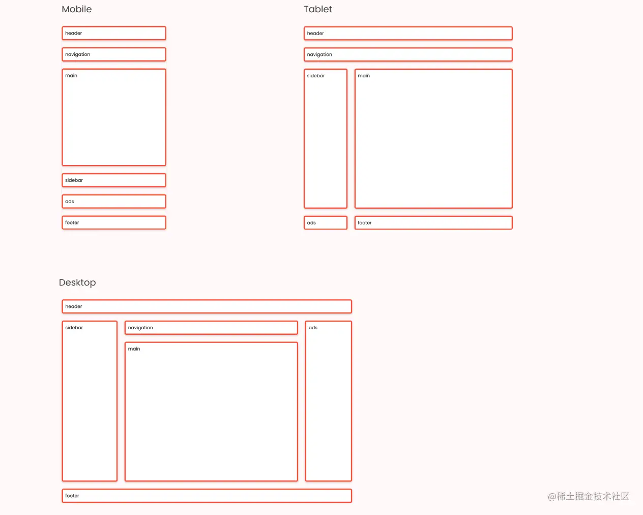 在这里,我们发现了与平板电脑视图类似的逻辑。对于桌面,我们创建了 4 列和 4 行,并根据 grid-template-areas 的值进行布局。